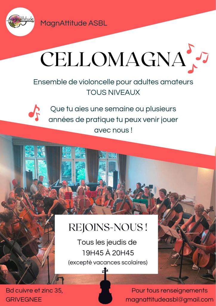 CelloMagnA Ensemble de violoncelle pour adultes amateur.es Tous les jeudis de 19h45 à 20h45 – Bd cuivre et Zinc, Grivegnée